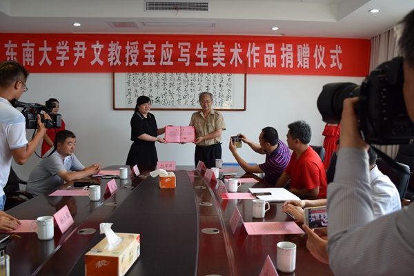仪式上,东南大学艺术学院领导将尹文教授的书画作品捐赠给宝应县人民政府,其中包括“射阳春望”、“藏陈故里”、“龙竿晓钟”、“水泗荷园”、“白田安宜”、“学宫迎秀”、“松鹤清源”等十一幅以宝应文化遗产景点为主题的中国水彩画,这些作品气韵浑然天成、妙趣匠心独具,具有较高的艺术价值。宝应县人民政府为尹文教授颁发了收藏荣誉证书,并将其作品列为不可移动文物,交由宝应博物馆永久收藏。这也是宝应博物馆首次将当代书画作品作为馆藏文物进行保管。