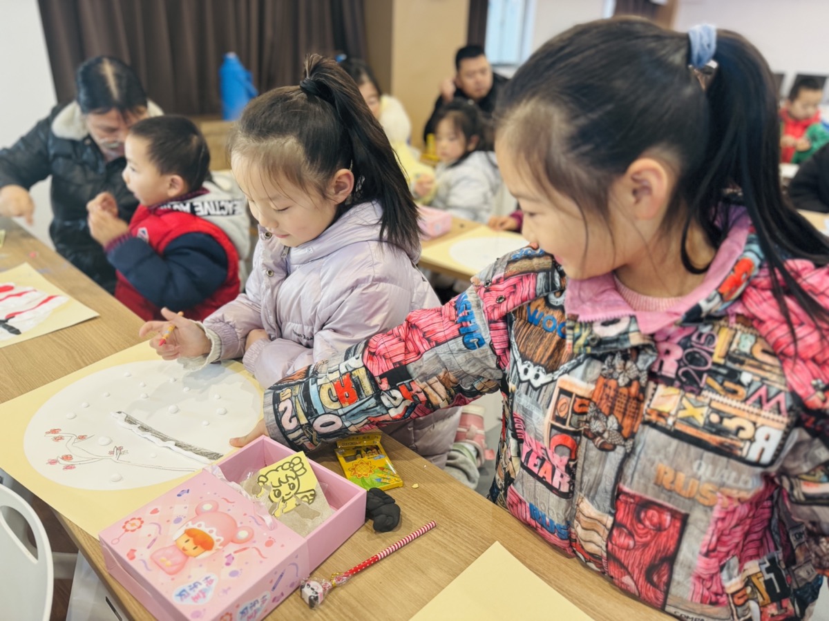 活动开始,工作人员从播放二十四节气趣味故事短视频引入今天的主题——大雪,并通过PPT课件向孩子们介绍节气的由来、大雪气候的变化、民间习俗等知识,让孩子们对节气文化有了初步了解。在问答互动环节中,孩子们热情高涨,积极踊跃参与答题,在欢乐有趣的氛围中,加深了对节气的认识。随后,在工作人员的耐心指导下,孩子们充分发挥自己的想象力和创造力,用黏土和蜡笔在扇面上通过揉捏、粘贴、绘画等步骤制作出了一幅幅属于自己的初冬创意画。制作完成后,孩子们拿着自己制作的初冬创意画互相欣赏、交流。